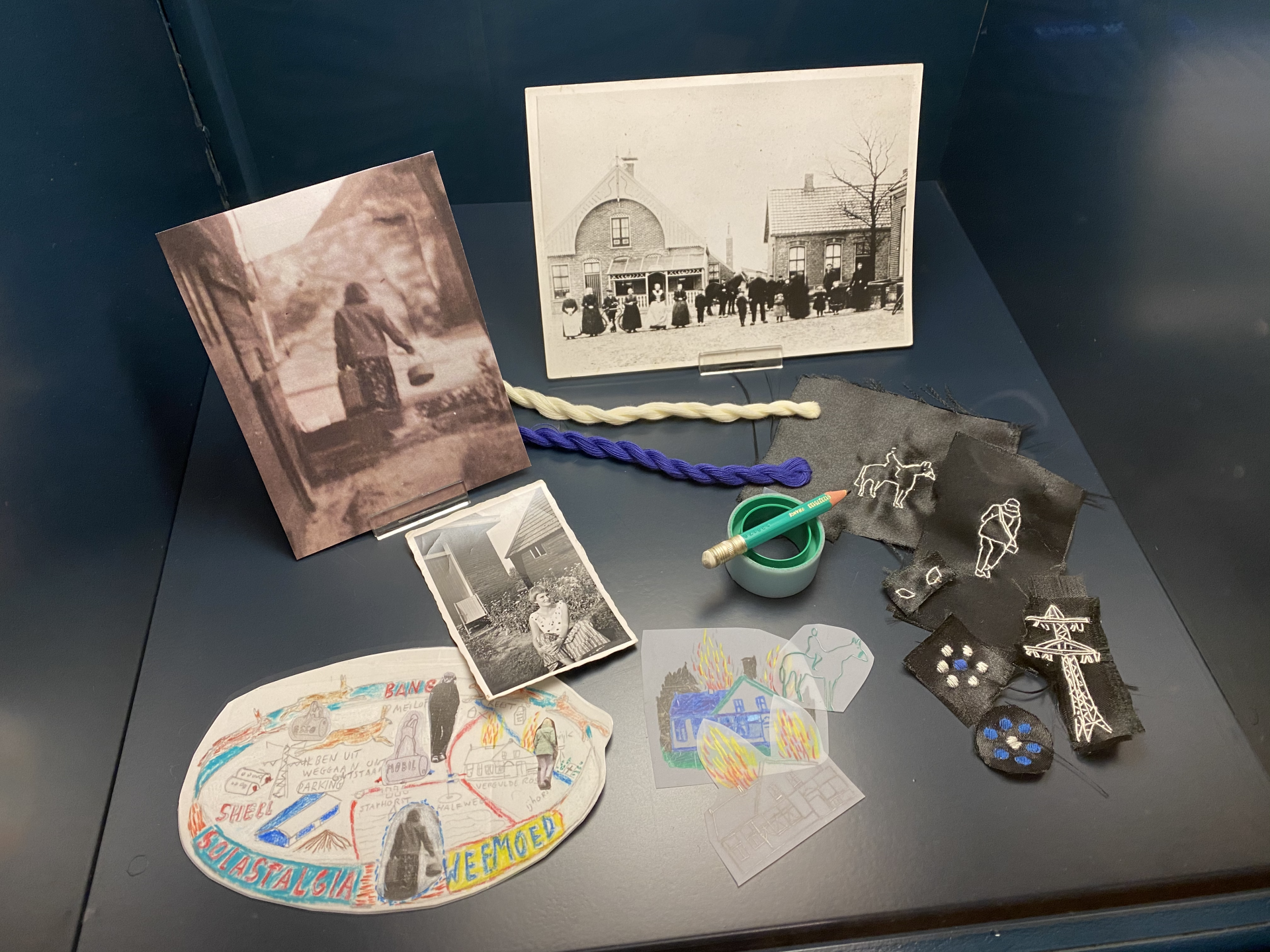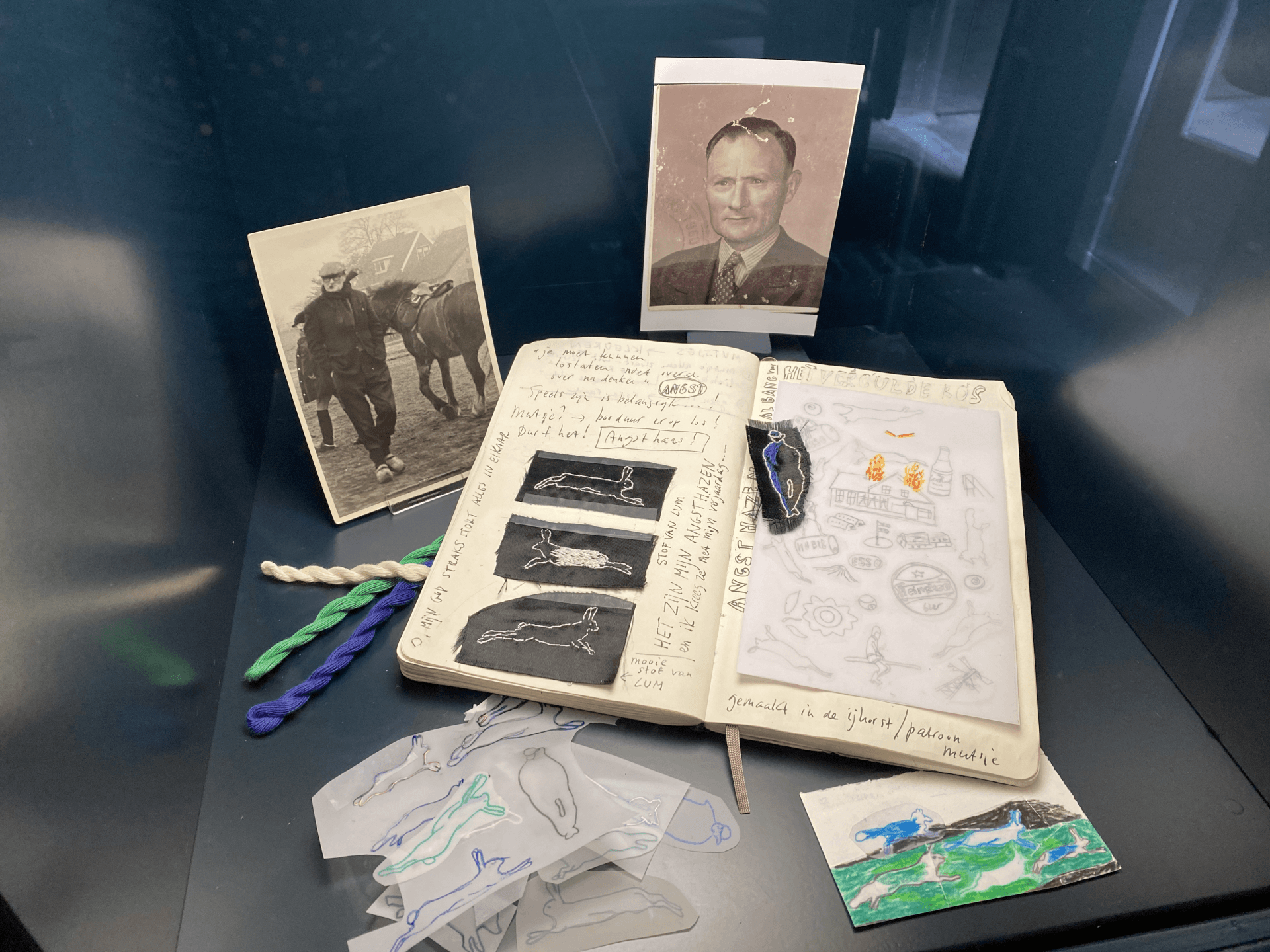 Tja, en daar zit ik dan thuis in mijn atelier. Met drie lege zwarte mutjes. Maanden ben ik aan stoeien. Schetsen. Nadenken. Wat wil ik vertellen? Resultaat kun je niet opeisen. Ik start een zoektocht. Ga de deur uit. Stel vragen. Leg verbindingen. Luister naar de verhalen van mijn moeder en haar zussen. Verborgen verhalen. Emoties die niet worden uitgesproken. Is waarheid belangrijk? Cryptomnesie Ik zie nieuwe foto's. Mijn tweelingbroer en ik. Spelend op de olietonnen in de paardenbak achter café In het Vergulde ros. Het is mijn waarheid waar ik denk grip op te hebben. Cryptomnesie noemt Jung het. Je herinnert je iets terwijl je niet beseft dat het om een herinnering gaat. Ik lees het boek Eigenzinnig kunstzinnig over Jung. Een kunstwerk ontstaat niet door diep na te denken of door hevig voelen maar door intuïtie. De kern van dit boek. Angsthazen Ik pak een vel en begin te schrijven. Alles wat in mij opkomt. De hazen. Mijn angsthazen. De dode haas die ik altijd van opa kreeg voor mijn verjaardag. Nog steeds ben ik gek op wild. De gele bloemen op het kuipje Becel van opa. Het kraaien van de vogels als we door het maisveld liepen. Het patroon van de mutsjes zit al jaren in mijn hoofd. Ik was alleen de bron vergeten. Verborgen herinneringen uit mijn onderbewuste. Een deel is verbonden met mijn jeugd in Staphorst.
