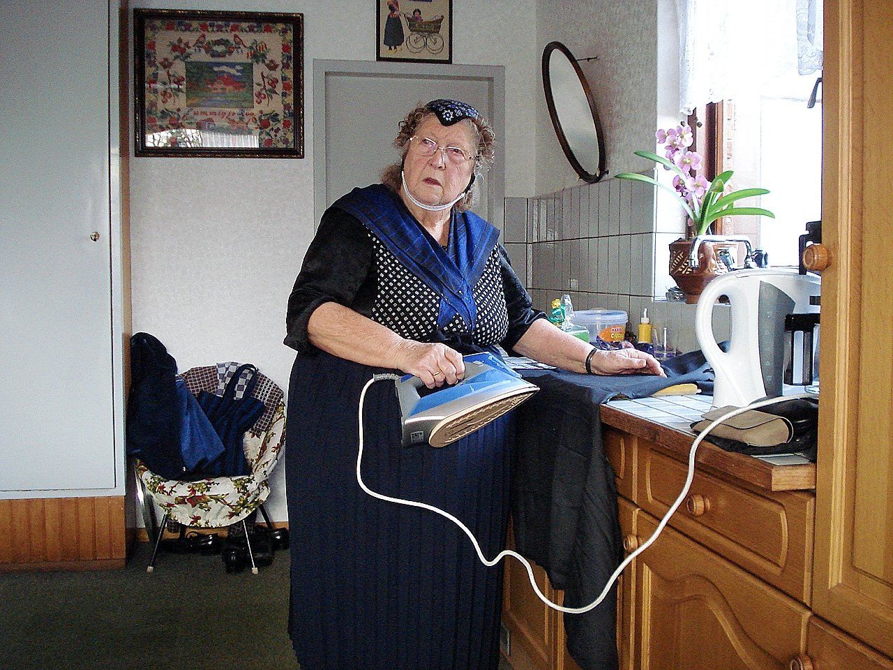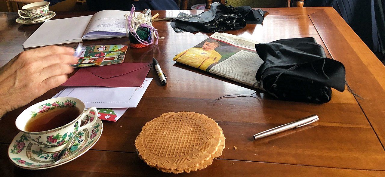 Ik ben bij Lum om de stof uit te zoeken voor het eerste mutsje. Ze geeft mij haar mooiste satijn. Het strijken van de stof doet Lum tussen het kletsen door bij het aanrecht. Bij elk kopje thee krijg ik een stapeltje zelfgemaakte kniepertjes. Een Staphorster traditie rond de jaarwisseling. Ik dacht een halfuurtje te blijven maar ik ben er heel de middag. Ook dat is traditie.
