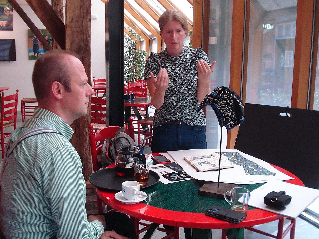Jacco werkt voor het Openlucht Museum in Arnhem en weet alles over klederdracht. Ook hij heeft zijn roots in Staphorst en is vrijwilliger bij het museum in Staphorst. Ik wil hem meenemen in mijn proces. Wil zijn advies want ik zit vast. Ik ben opgelucht als hij zegt dat de losse beweging van mijn hazen op de muts spannend is.